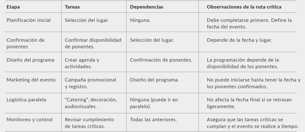 Tomando este ejemplo, ciertas actividades dependen de la finalización de otras, mientras que algunas pueden realizarse en paralelo y tienen cierta flexibilidad. La tabla a continuación resume las etapas principales, sus dependencias y la relevancia de cada tarea dentro de la ruta crítica, mostrando cómo la empresa puede asegurar que todas las actividades críticas se cumplan a tiempo.